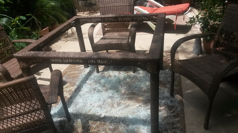 I had the patio set less than three months and had just gotten up from the table leaving my cellphone and drink there. I turned and walked a few steps away and heard an explosion and looked and the glass had exploded in a million pieces straight down on the outdoor rug. One minute earlier and it would have landed in my lap. The patio set had been in the shade the entire morning. The set presents a huge liability factor for Martha Stewart and given the reviews regarding this issue I am very surprised it is still on the market!