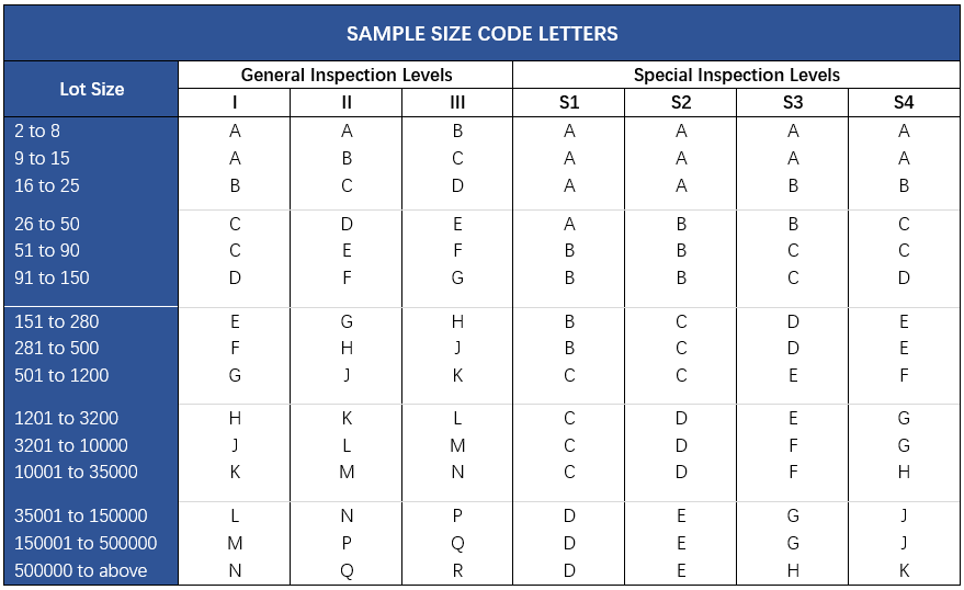 Sampling plan: you will find 7 levels from G-III (highest) to S1(lowest). A higher inspection level corresponds to a larger sample size, with GIII being the highest.