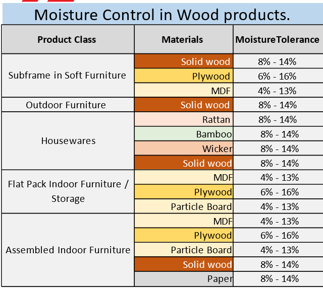 1. It’s important that moisture control tolerances are established at the outset in the product specification. Factory QC systems should include the checking of the moisture content of incoming wooden materials as part of their IQC program. These checks should be repeated prior to or during inline inspections on the production line to ensure that moisture values have not moved out of tolerance during storage. A moisture check within a final inspection will confirm that the finished goods’ moisture values are within tolerance before they commence their shipping journey. There may be wide variations in temperature and humidity in transit so the correct baseline moisture value is very important.
