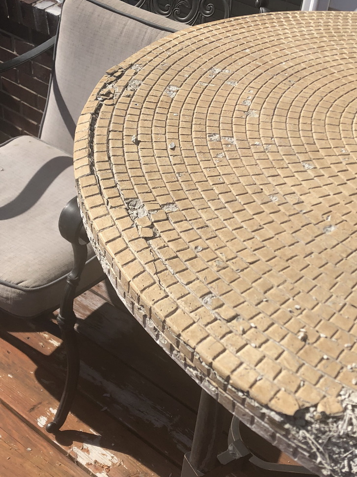 I purchased a tile patio table 3 years ago from Home Depot and as soon as we put the furniture together a couple of tiles fell off. At that time I didn’t think it was that big of a deal, I glued them back on. But after that every time we used the table more fell off. We took really good care of the table. Always stored it in the basement and kept it covered when not in use. Today the table is an eyesore. We paid good money for this table which no we can't use. The table is crumbling. It’s the cheapest made table I’ve seen. The tiles are layered on styrofoam. I’m not sure what to do now. I will be contacting Home Depot as well.